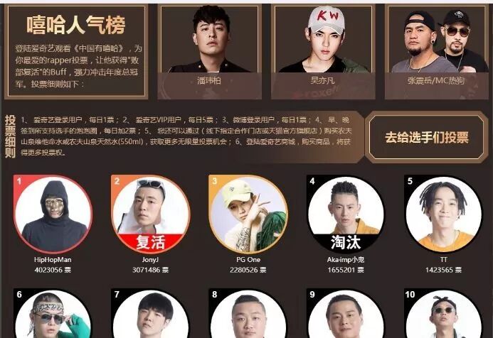 《中国有嘻哈》、《明日之子》等真人秀的推出将网络综艺选秀推向前潮。不需要繁琐的编辑短信,而是直接在客户端投票支持,开启了全民互联网票选时代。