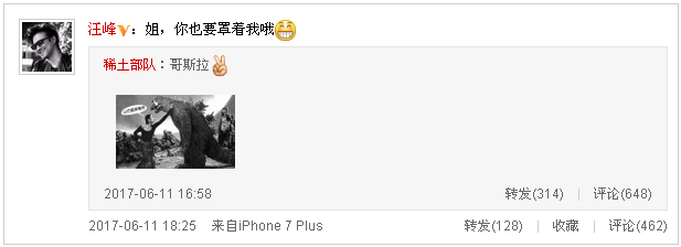 6月11日,章子怡晒和怪兽PS照并配文“哥斯拉”,照片上写有“以后姐罩着你!”惹得汪峰喊话,同求被罩~