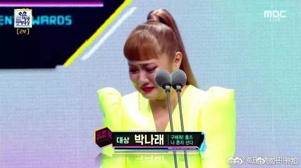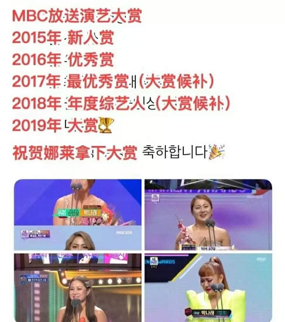 昨晚的MBC演艺大赏上,朴娜莱终于在陪跑四年之后,终于拿到了大赏。