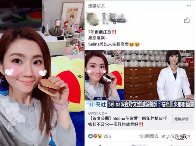 Selina曾经被烧伤,有些无良商家却利用她的伤疤大做虚假广告,她特意发微博澄清,并说到“疤痕从没消失,你们看到的美丽照片,都是我用真心笑容,以及大量修图软件完成的!请你们千万不要被骗了!”宁愿暴露自己的疤痕依然存在,也不愿意粉丝因为对她的信任买产品而受骗,元气满满的Selina太暖了!
