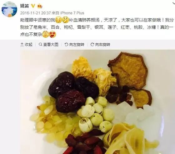 不久前,姚笛在微博上发了一锅自己煮的汤,来展现自己的贤惠