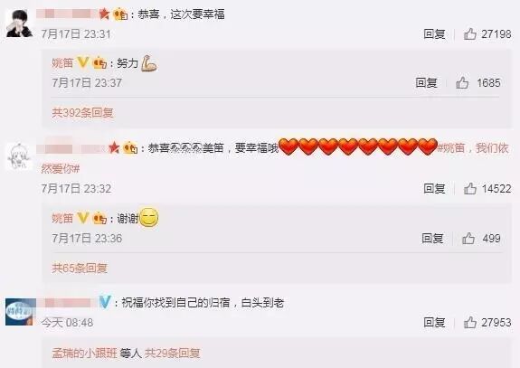 不过在姚笛的这条微博底下,几乎只看到了祝福的评论