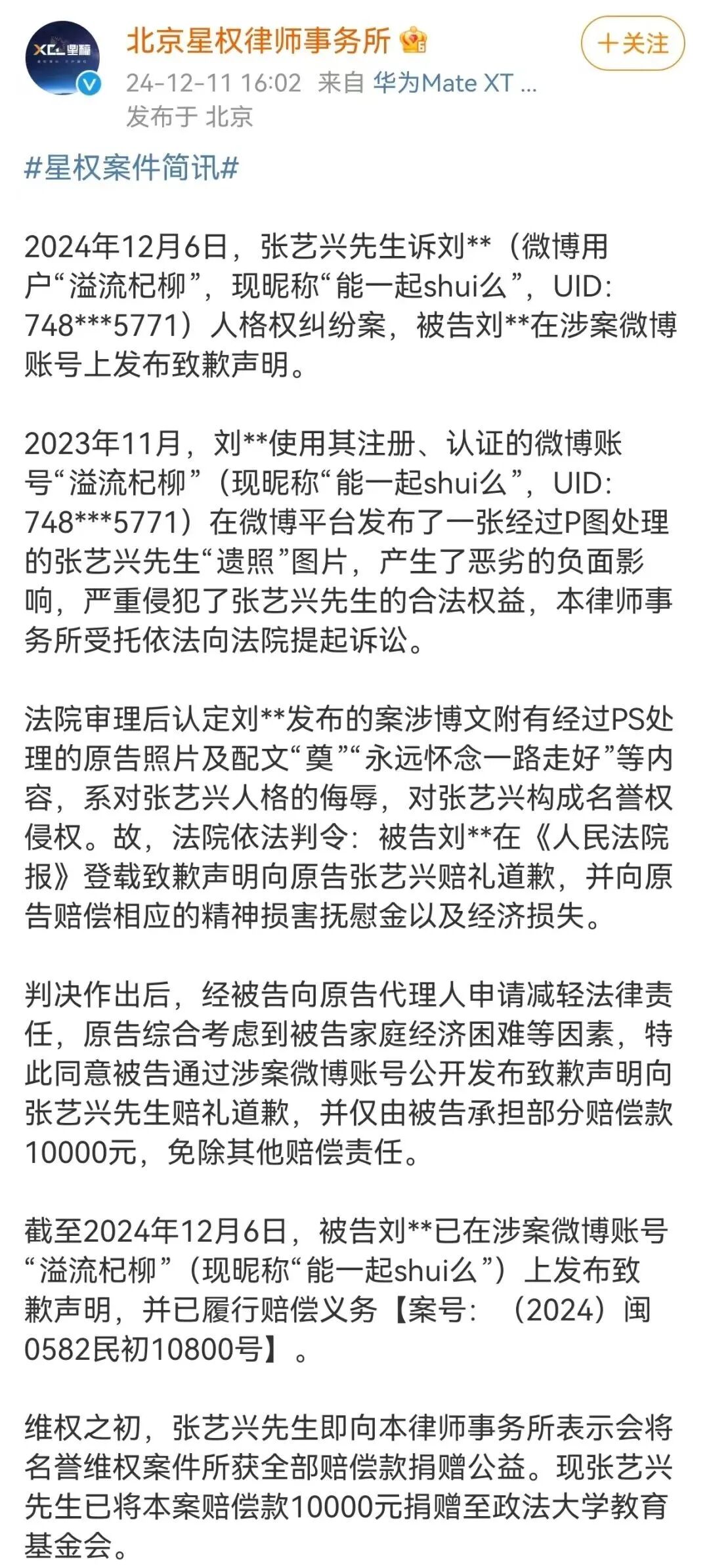 判决作出后,经被告向原告代理人申请减轻法律责任,原告综合考虑到被告家庭经济困难等因素,特此同意被告通过涉案微博账号公开发布致歉声明向张艺兴赔礼道歉,并仅由被告承担部分赔偿款10000元,免除其他赔偿责任。