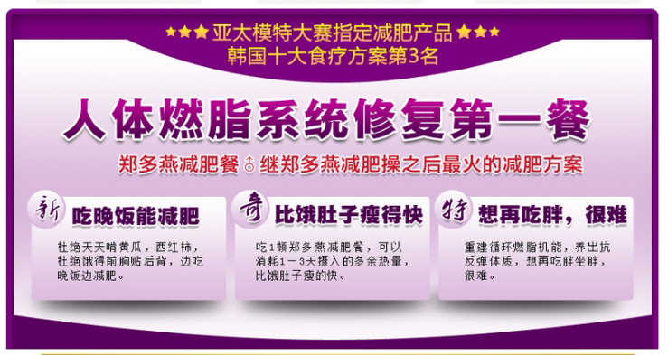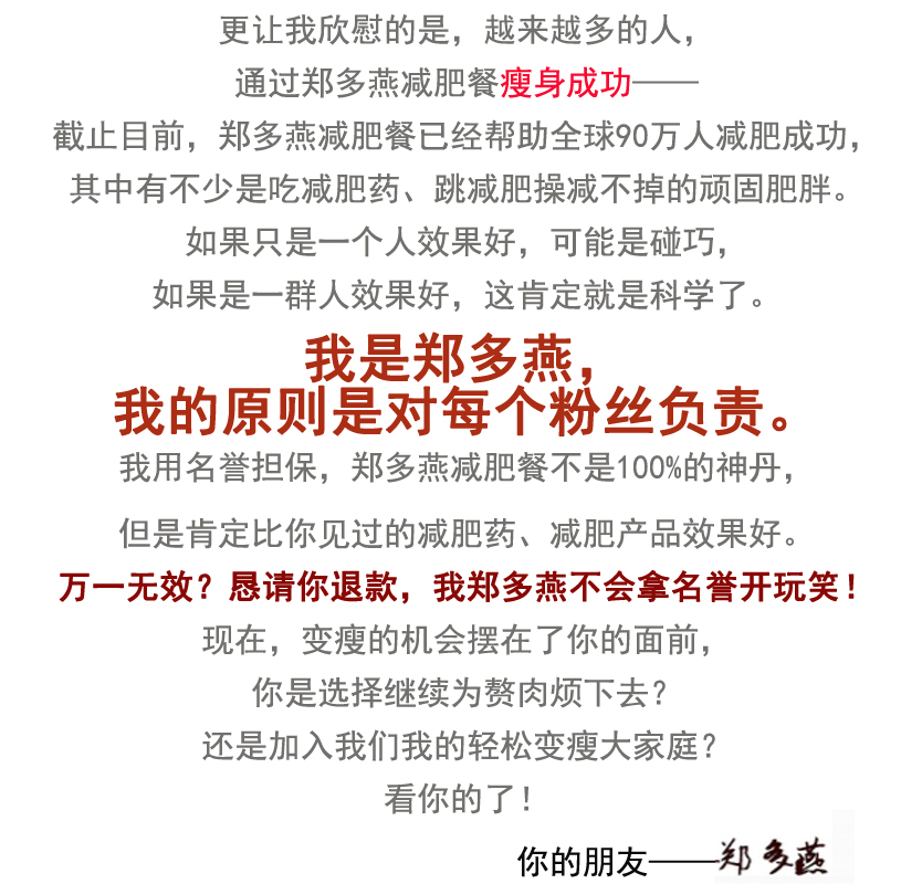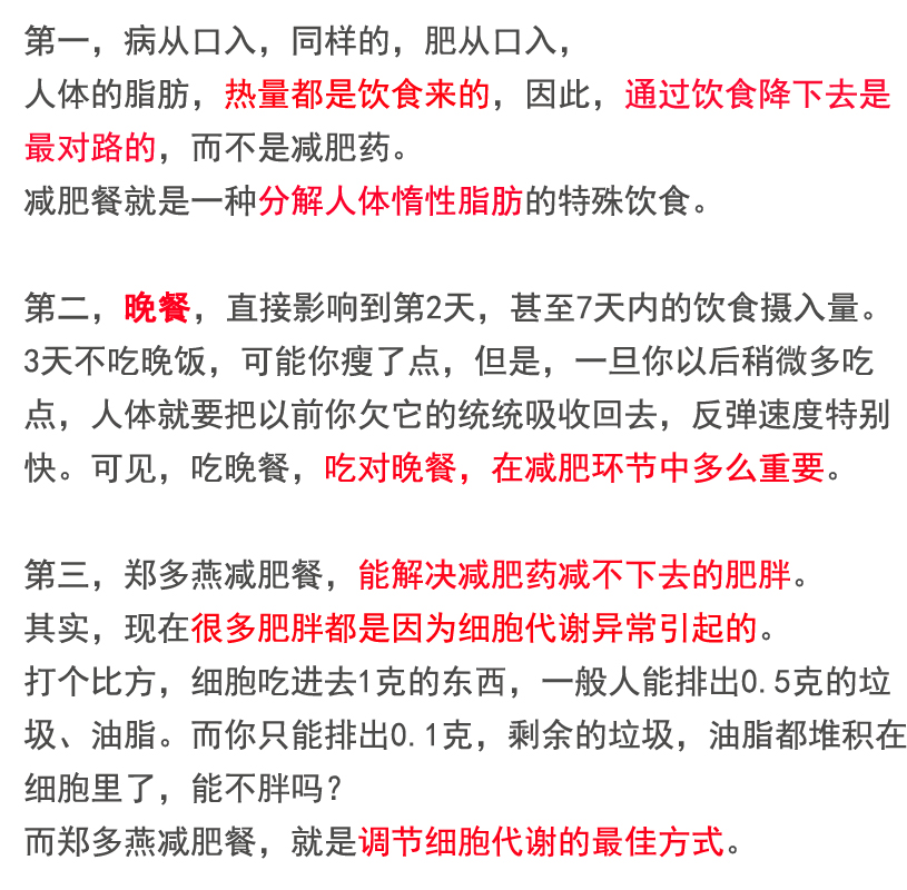 郑多燕减肥餐,可阻止吸收多余热量转化为脂肪,并阻断“把脂肪储存起来”指令的传递,让多余脂肪进不来。