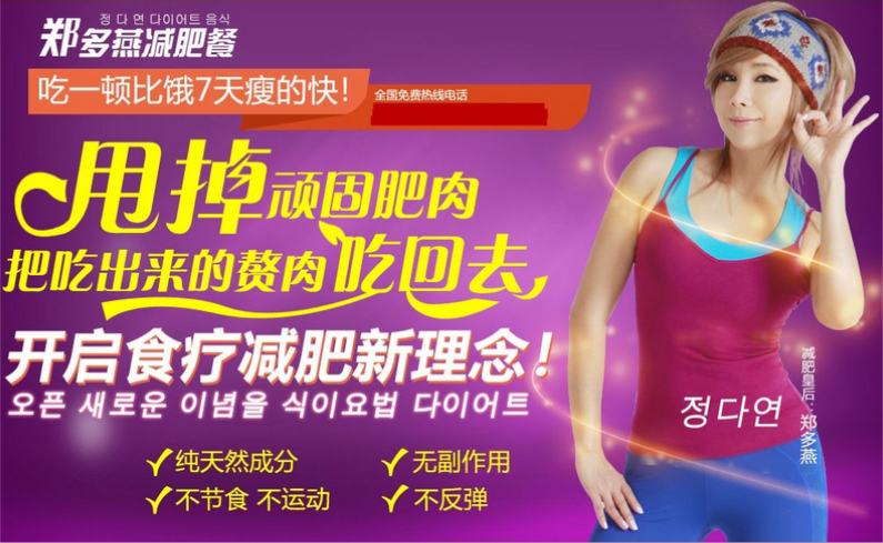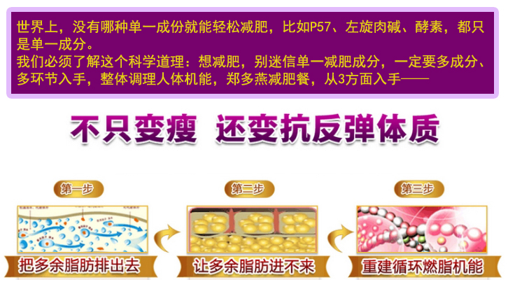 郑多燕减肥餐,富含“脂肪化解弹”化脂素,快速突破脂肪层,层层化解顽固脂肪,并将其分解成为游离态小脂肪分子,随汗液尿液排出体外。
