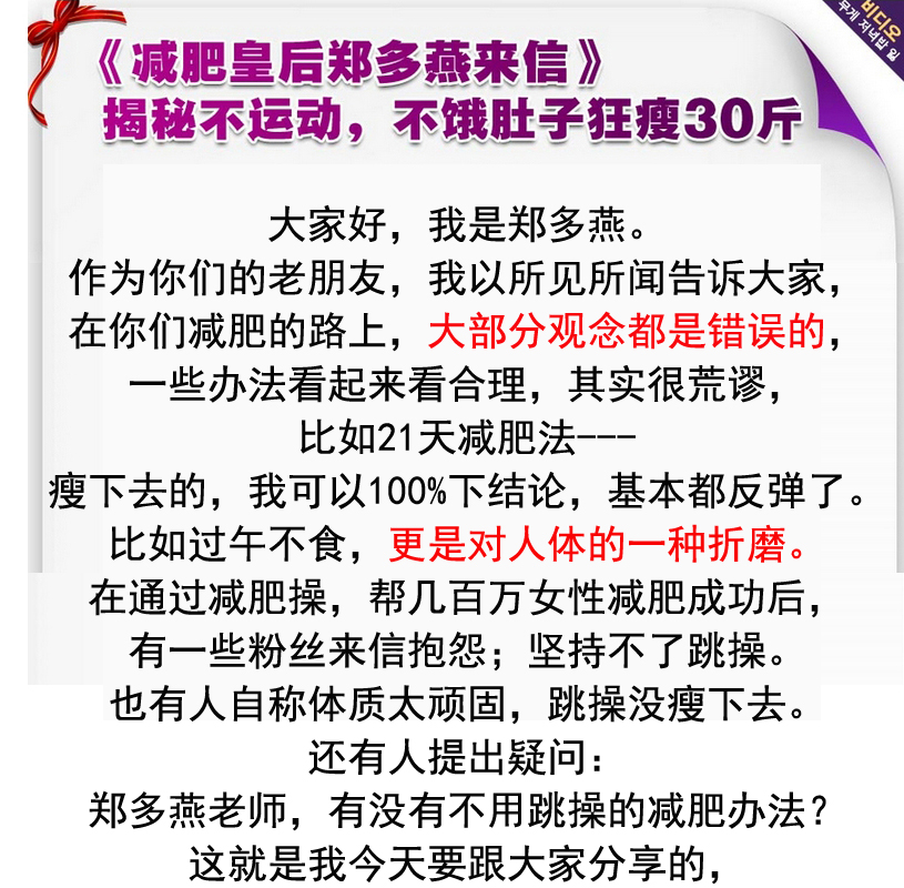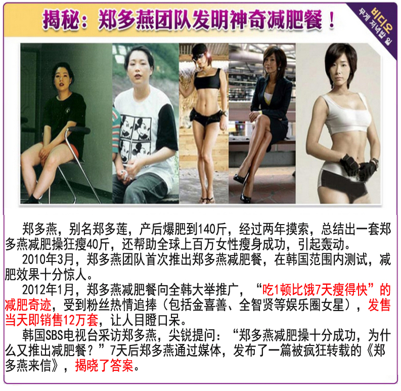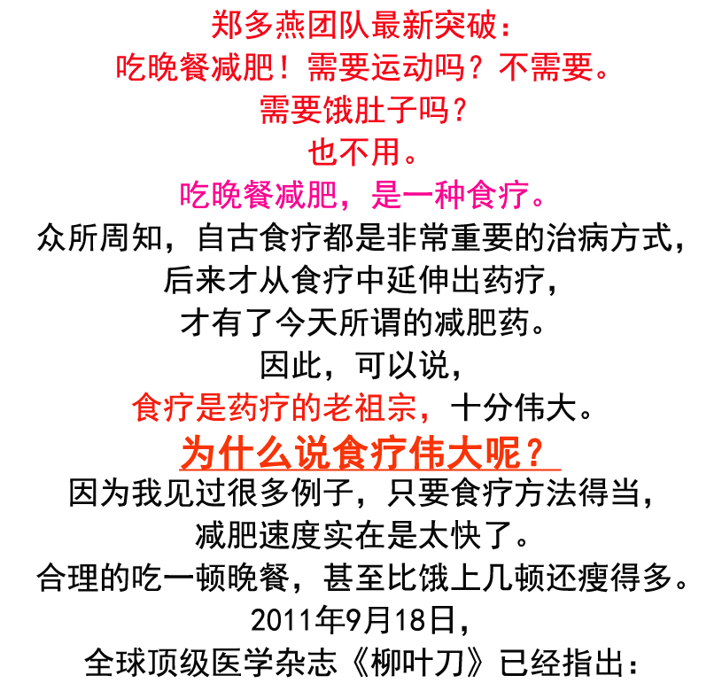 赶紧来看看郑多燕减肥晚餐吧,一款可以真正助您“减肥成功”“健康瘦身”,真正结束您的减肥生涯,步入苗条身材行列的神奇宝贝!