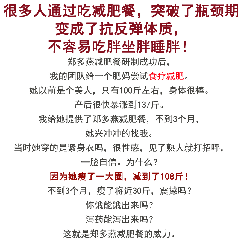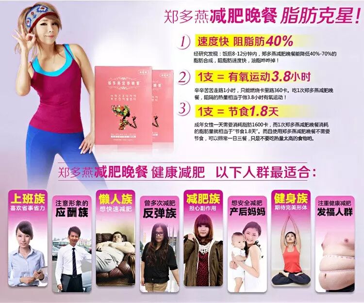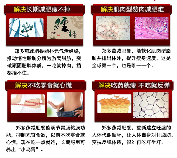 郑多燕减肥餐,可补元气调经络,重新建立旺盛的人体代谢循环,变抗反弹体质,即使停止服用晚餐,也能自行燃烧多余脂肪,很难再吃胖坐胖。