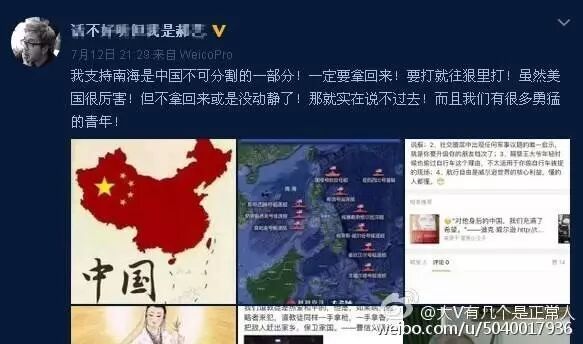再比如,在7.12南海仲裁事件之前,某网友的微博画风是这样的: