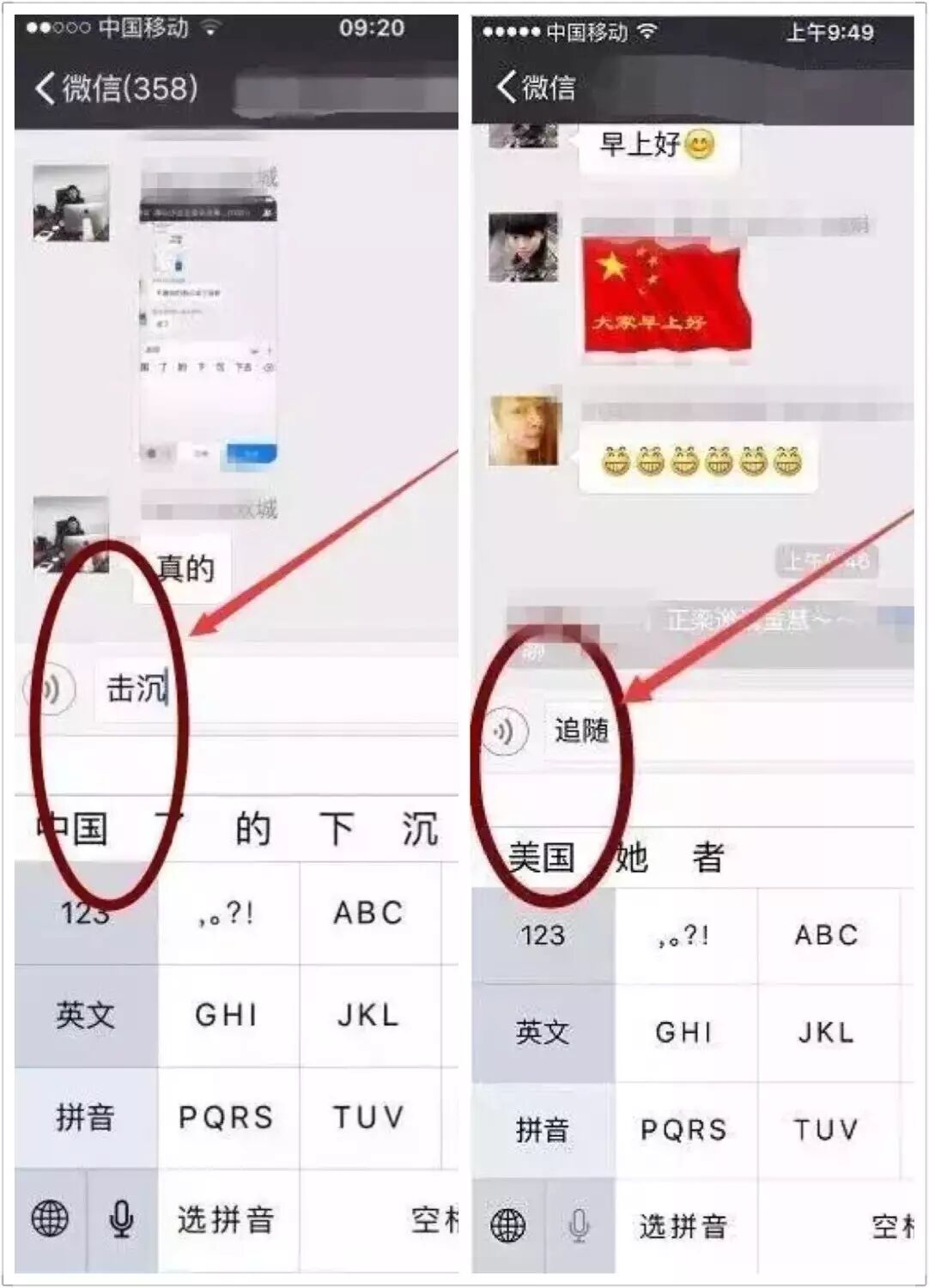 输入“击沉”之后,苹果手机联想出的第一个后缀竟然是“中国”;对应的,输入“追随”之后出现的词汇是“美国”。