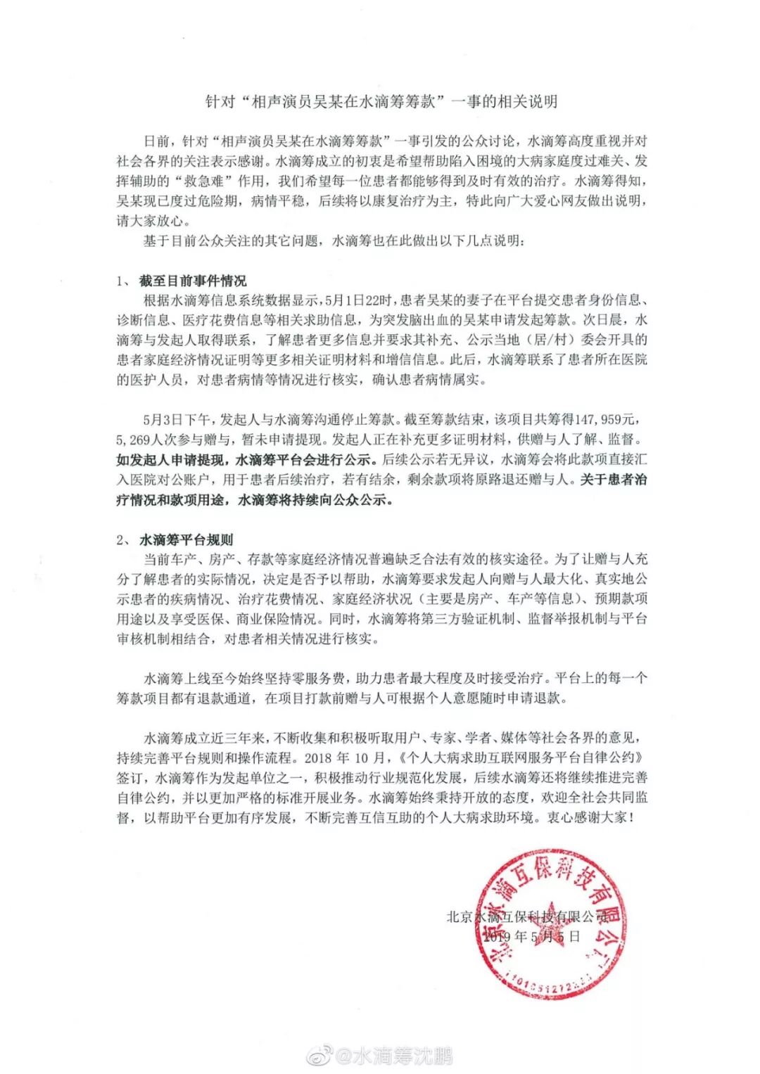 5月5日晚间,水滴筹也发布了关于“相声演员吴某在水滴筹筹款”的相关说明。