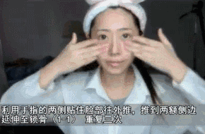 从额头中间往两侧推,推到太阳穴轻松一下。往下延伸到脸颊两侧一直推到锁骨,重复三次