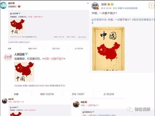 最近金马奖闹出来的事情真的太多了,金马奖这边颁奖还没有结束,人民网就率先发出了中国的地图,并附上了一句“中国,一点都不能少”,一看就是对金马奖上事件的表率,而对于官方的态度,娱乐圈很多明星也非常上道,纷纷转发标明态度。