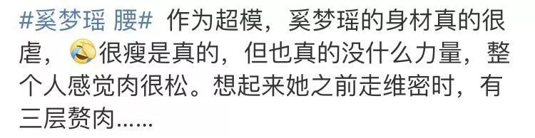 作为0号身材的超模,奚梦瑶的腰上有赘肉,真的不是第一次被吐槽了,要做她的修图师,大概被考核的第一项能力就是“P腰功夫”。