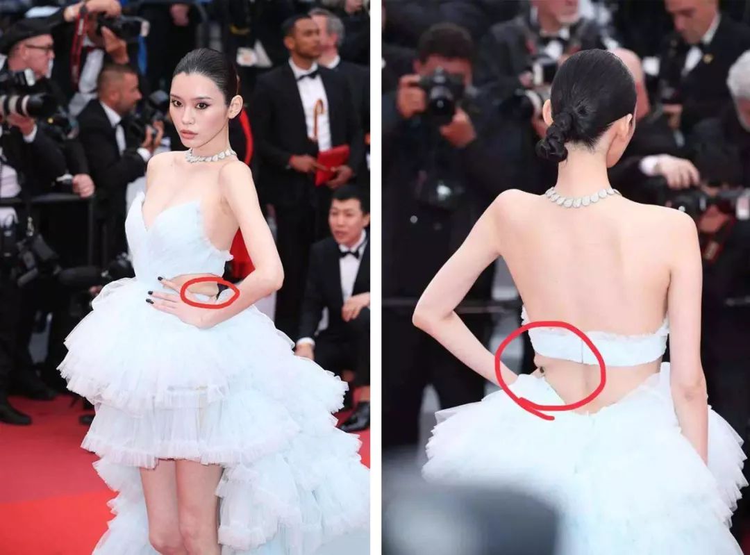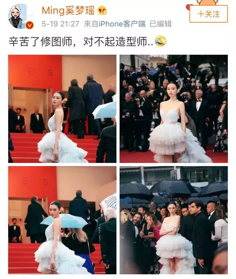 相比之下,同样在戛纳红毯上被生图所伤的奚梦瑶,选择强做淡定,并且向修图师致敬。