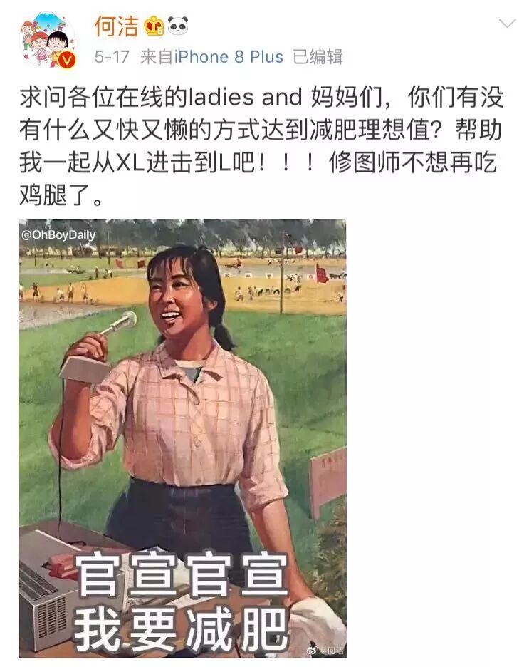 何洁已经在线求助,说她的修图师“不想再吃鸡腿”,问大家有没有“又快又懒的方式达到减肥理想值?”