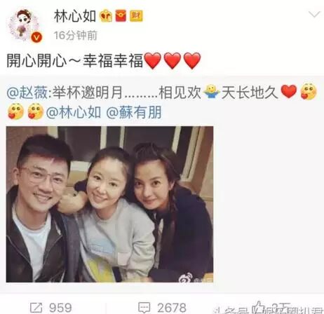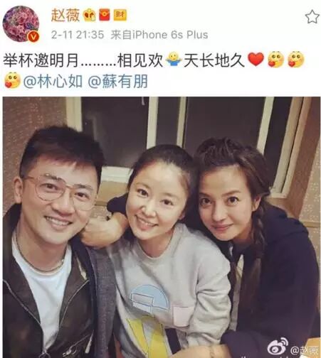 而元宵节当天,林心如的好友赵薇也在微博中晒出与她本人的合照,照片中还有苏有朋,并且发文称:“举杯邀明月……相见欢,天长地久。”