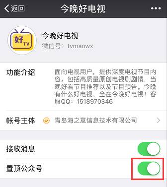 然后点击“置顶公众号”,今晚好电视就可以在订阅号的第一位置啦,精彩从此不会错过。