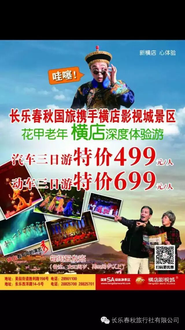 【长乐春秋旅行社金峰营业部】携手横店影视城.重磅推出老人横店影视城3日游惊爆价499元,另赠送200元话费,长乐包车往返,为感谢新老顾客对我社长期的大力支持,孙俪,王珞丹等明星大腕签名手机壳,U盘现在免费送啦!!!!长乐金峰的小伙伴们,抓紧时间行动啦!!!