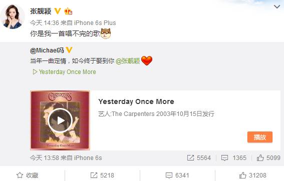 去年十月,张靓颖和冯柯在微博上冯柯一起撒了一大波狗粮,以此来宣布他们婚姻的开始。