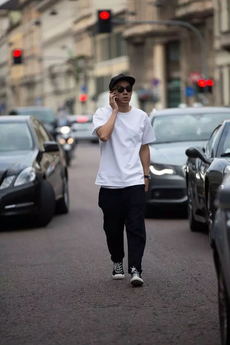 白色oversize tee+黑色宽裤+匡威