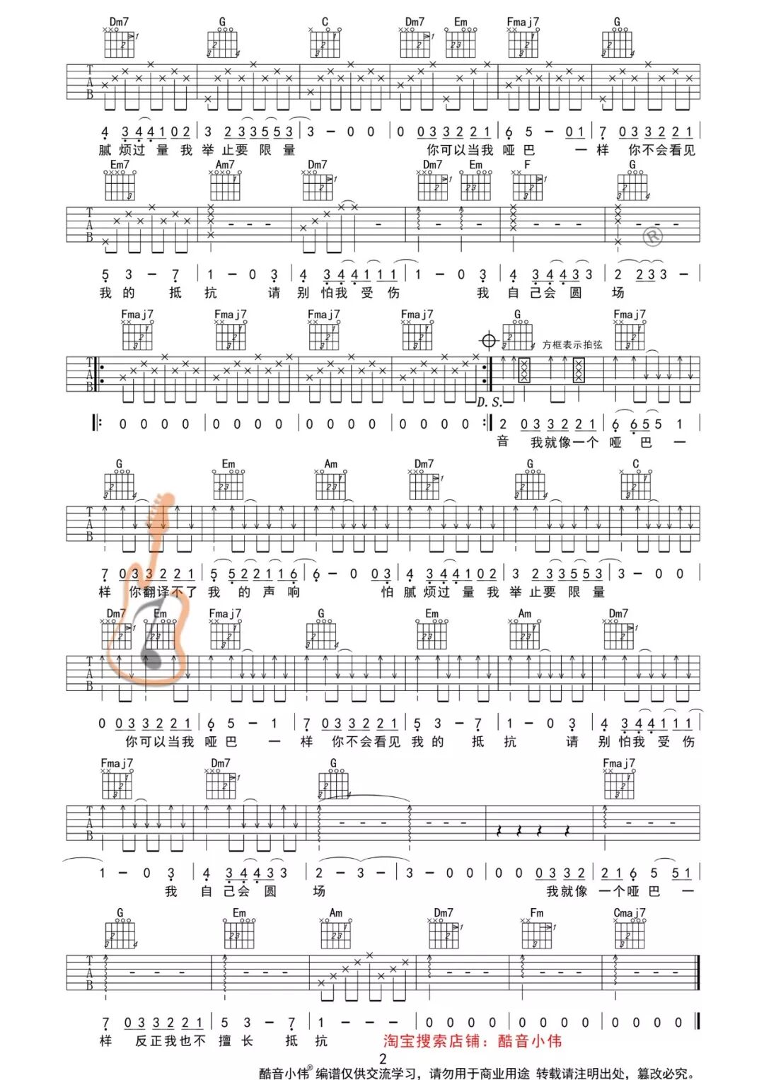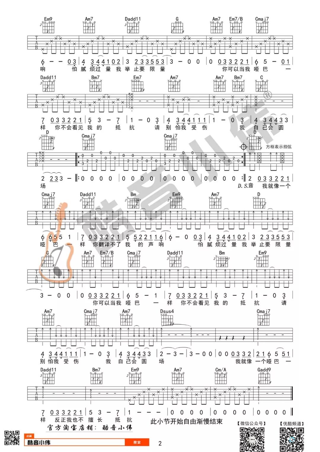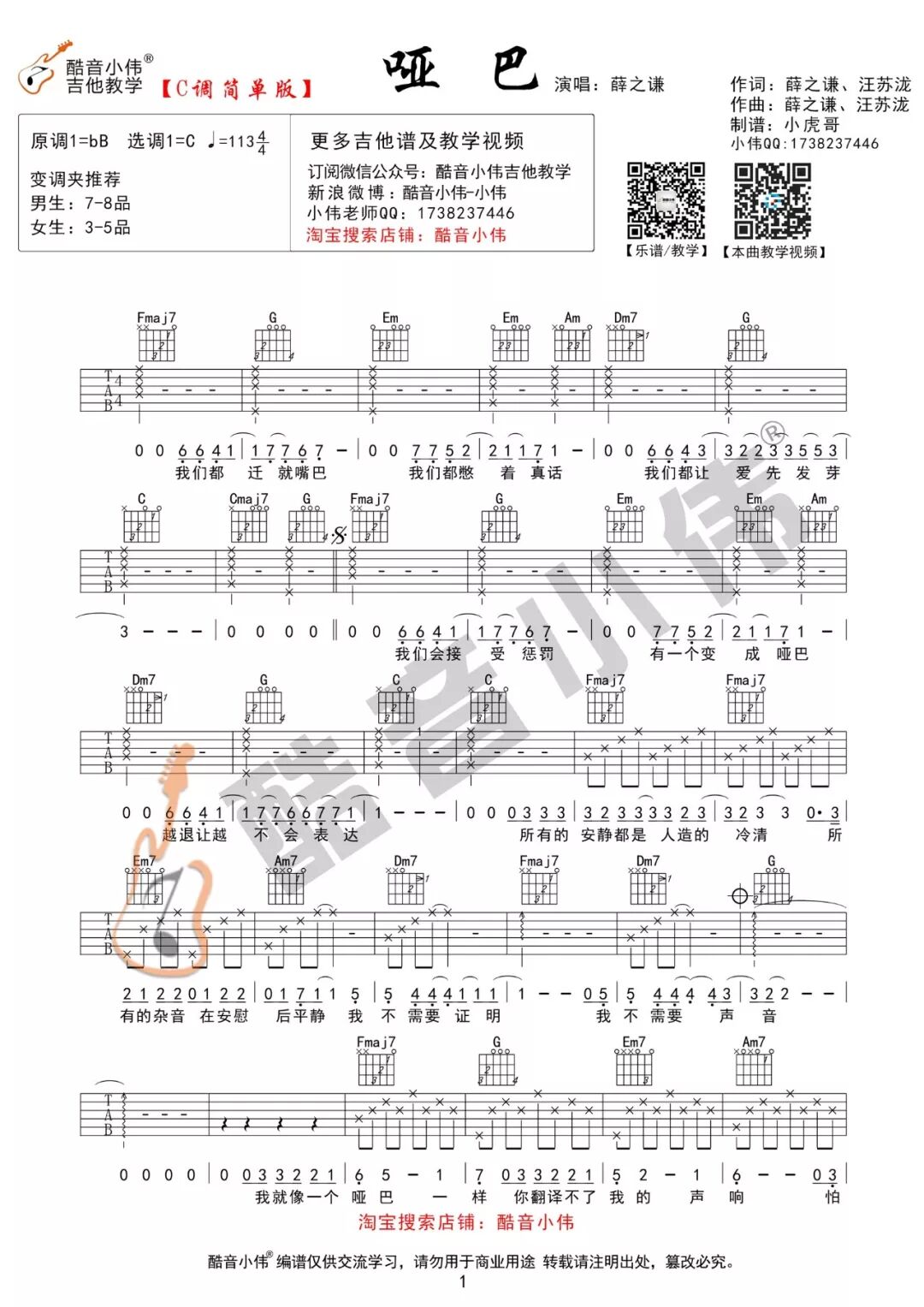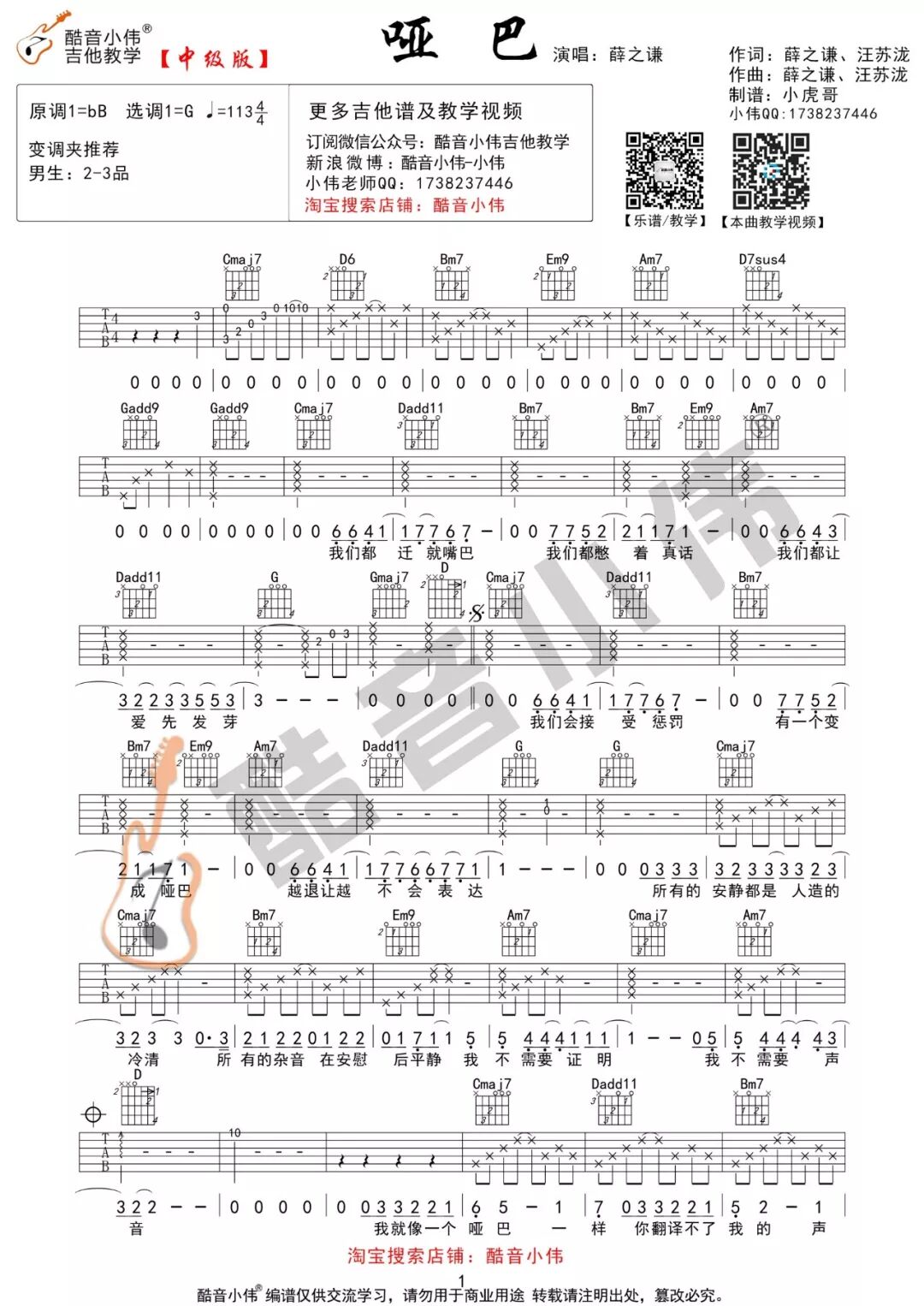 薛之谦《哑巴》吉他谱及教学视频发布 (酷音小伟吉他教学) 酷音小伟吉他教学 内地男星 2018-05-26 00:41:12 950 创作不易,用心坚持,欢迎请BaGua喝几杯爱心咖啡!打赏并支持本文 打赏并删除本文 《哑巴》弹唱演示及视频教学演示用琴:楚门 J-850FE 学习歌曲弹唱的步骤第1步:熟练弹会此首歌曲的和弦伴奏第2步:能够熟练清唱出此首歌曲第3步:弹唱结合此歌曲G调指法中级版吉他谱点开图片,看大图保存即可!C调指法简单版吉他谱点开图片,看大图保存即可!戳原文,更有料!可观看/下载教学视频,记得关注我的优酷频道哦! 创作不易,用心坚持,欢迎请BaGua喝几杯爱心咖啡!打赏并支持本文 打赏并删除本文 感谢您的支持鼓励,我会继续努力的!文章地址:用户邮箱:打赏金额:USDT 请输入数字点击”去打赏“,即可进行打赏支持本文章哦 薛之谦 About the Author 酷音小伟吉他教学 功能介绍:酷音小伟吉他教学,每周更新热门歌曲教学视频&吉他谱。并提供吉他零售、批发业务欢迎垂询QQ:83588700 Related Posts 邓紫棋《光年之外》吉他谱及教学发布(酷音小伟弹唱教学) 2019-01-27 20:58:13 郑伊健《友情岁月》弹唱演示及教学发布(酷音小伟吉他弹唱书籍配套教学) 2018-12-30 22:35:34 齐秦《大约在冬季》弹唱教学(酷音小伟弹唱书籍上册教学视频) 2018-11-18 17:34:00 《天已黑》杨宗纬 吉他谱 酷音小伟吉他教学 2018-10-27 18:10:50 薛之谦《哑巴》吉他谱及教学视频发布 (酷音小伟吉他教学) 2018-05-26 00:41:12 发表评论