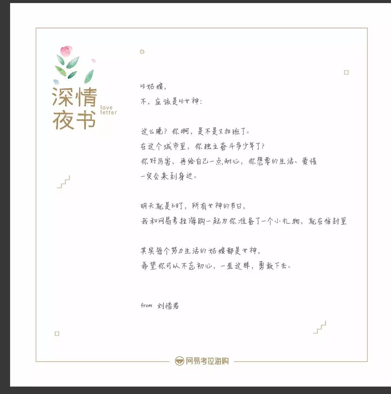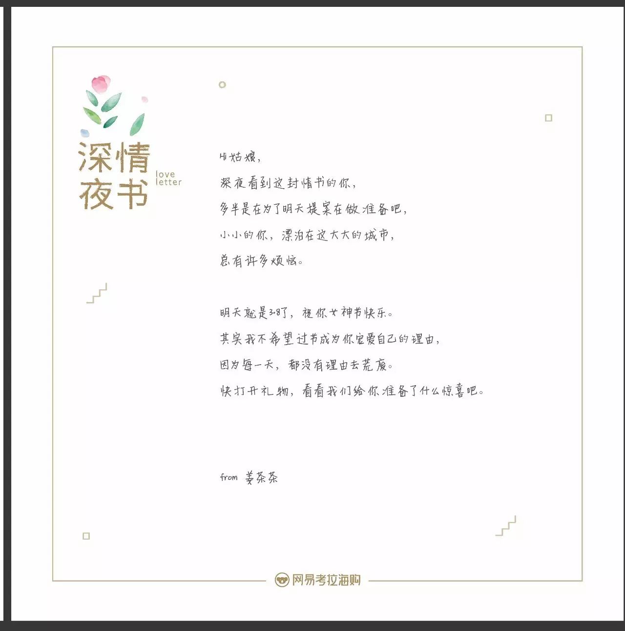 这是网易考拉在女神节这天做的“深夜情书”活动。选择在这天为大城市里奋斗至深夜的姑娘们送上一份温暖。洞察其实挺简单且实用的,比起功利的折扣,一份有温度、有关怀的礼物对女性的治愈是更为入心的。想象一下,一个独自在大城市打拼的姑娘在女性备受关注的这几天还要加班,还要赶地铁、打出租,内心就像这还未真正入春的天气,有丝丝的凉意。能收到网易考拉准备的这份由多位明星参与的深夜且是私人的情书,再配上一份小礼物,真的挺暖心的。