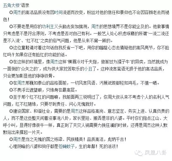 这个ID为“五角大楼”的网友,别的帖子都不回,专门为周杰洗白,语气和用标点的习惯被指和周杰如出一辙……有热心网友据此整理出了一份“五角大楼”语录——这绝对可以说是夸赞周杰的典范了。