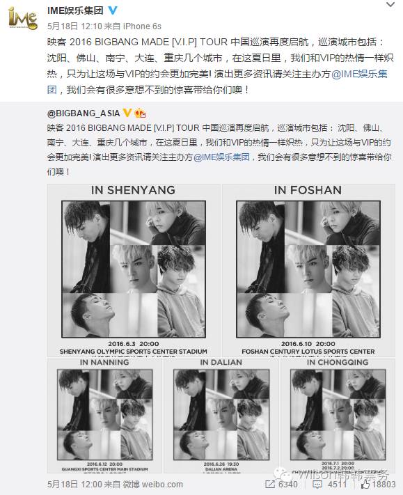 BIGBANG全程主办方IME娱乐集团官方微博