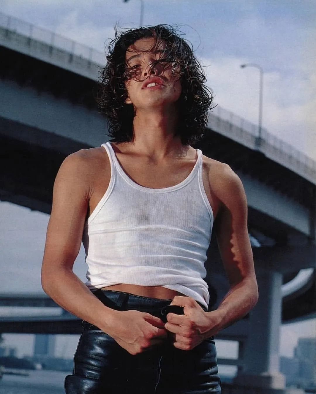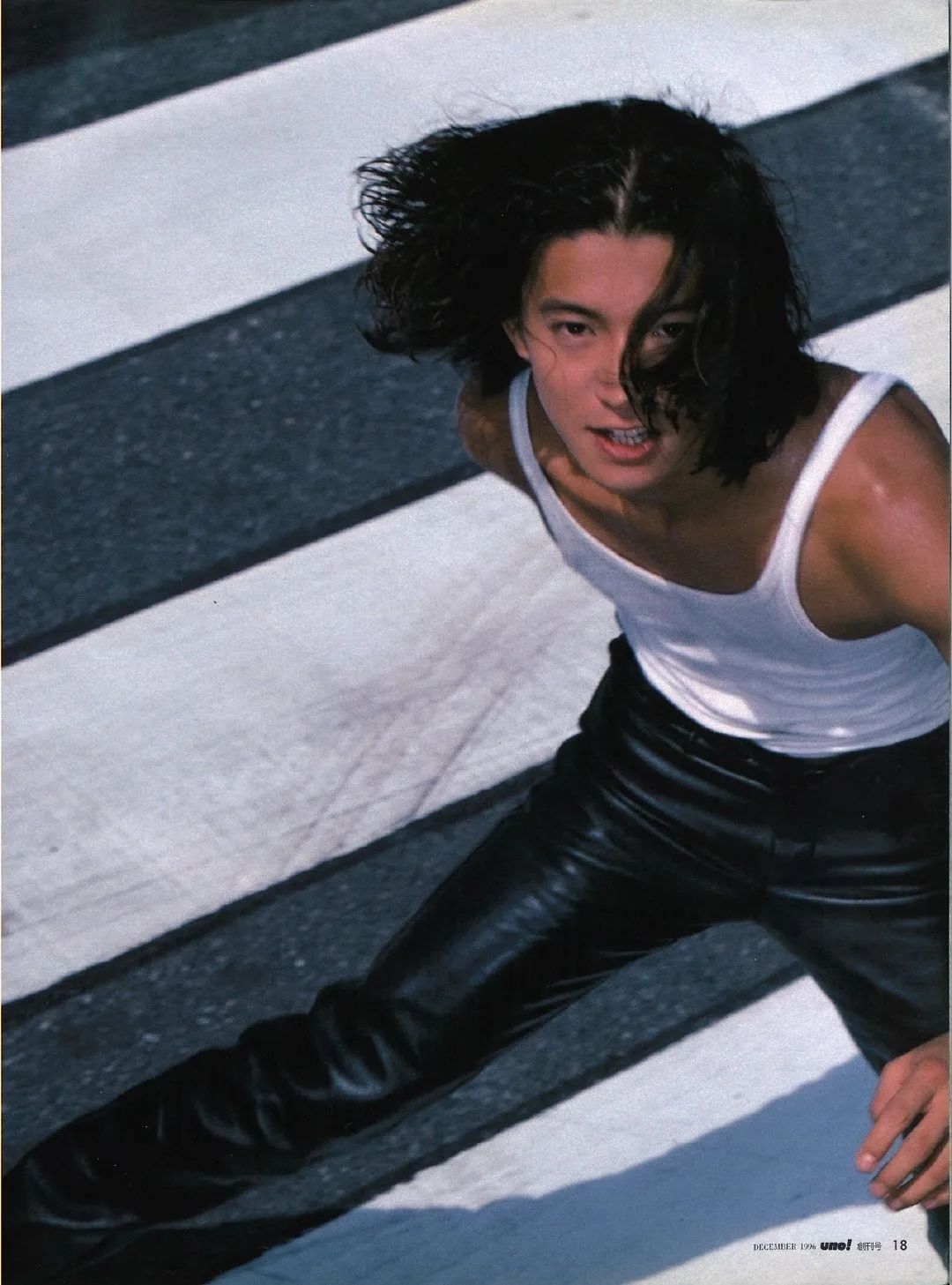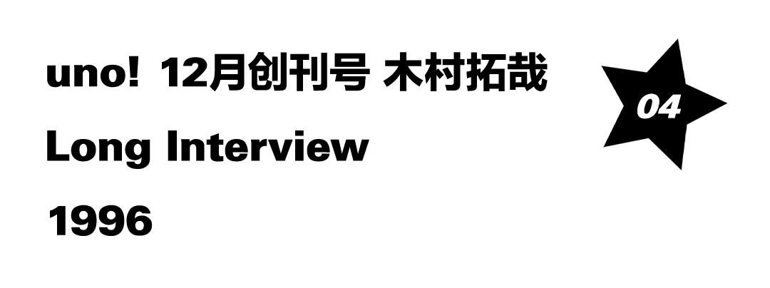 日本杂志 UNO! 在创刊号找来了当时炙手可热的木村拓哉作为其首个封面人物,并由知名摄影家筱山纪信掌镜拍摄。奇妙的是,在这本冬季发行的期刊上,木村拓哉以一头湿发造型,穿着白色 Tank Top 和标志性的黑色皮裤奔走在夏日街头,扑面而来的自由气息冲破了寒气,将 24岁木村拓哉身上的不羁和洒脱展露无遗。