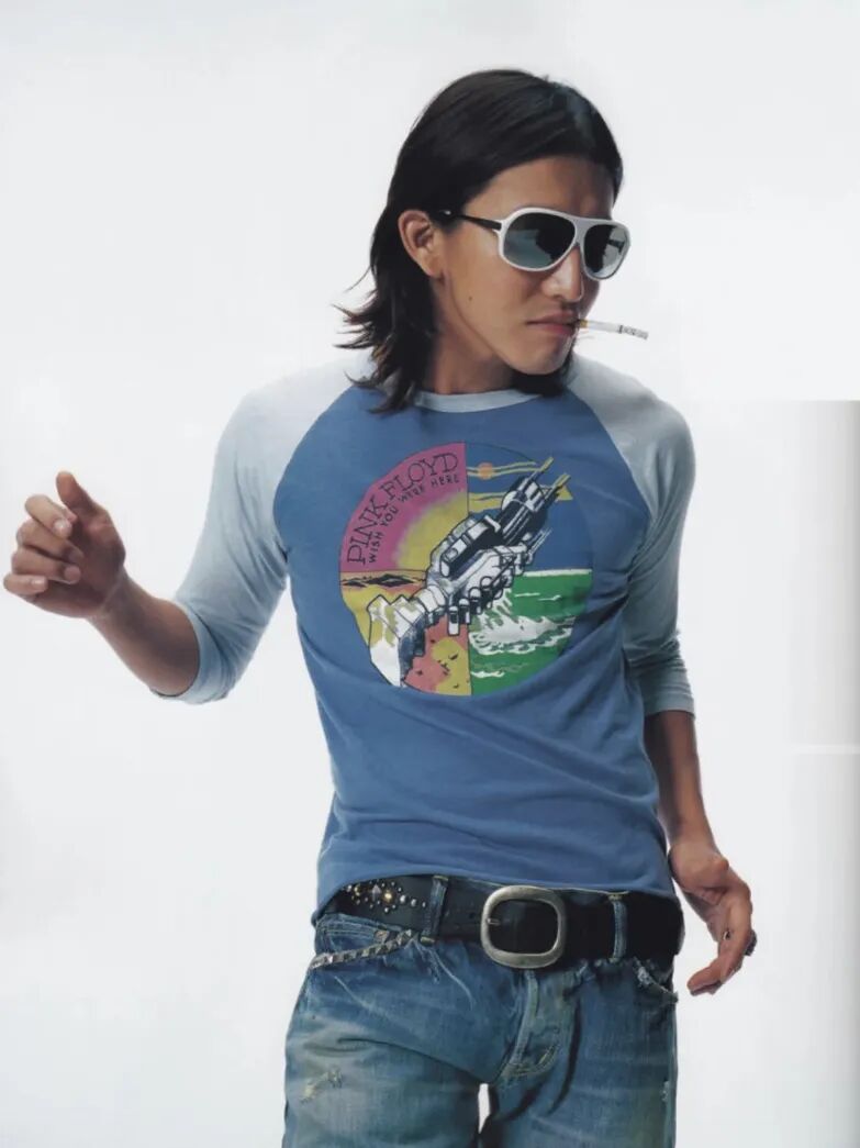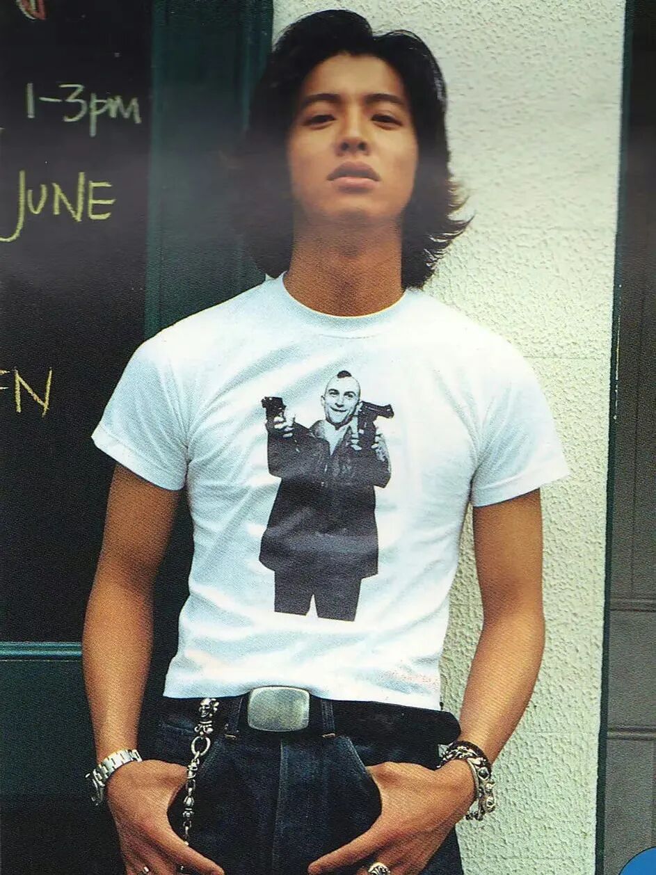 略紧身的 T 恤再随意搭条裤子是木村拓哉最常见的日常穿搭,而他往往会选择一些具有某种趣味性的古着 T 恤,例如画着裸露女人的涂鸦短袖 、Pink Floyd 乐队的《Wish You Were Here》周边衣服、印着导演 Martin Scorsese 1976 年的经典作品《Taxi Driver 出租车司机》反社会人格男主 Robert De Niro 的上衣等。这些 T 恤往往能为简单的造型增添几分好玩搞怪的深意,一如拓哉本人的个性。