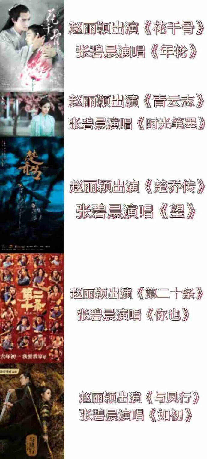 她们俩当初就是相识于《楚乔传》片头曲的合唱,之后就是一拍即合、互动频繁,赵丽颖参演的作品,她都会主动给剧组推荐张碧晨唱主题曲。