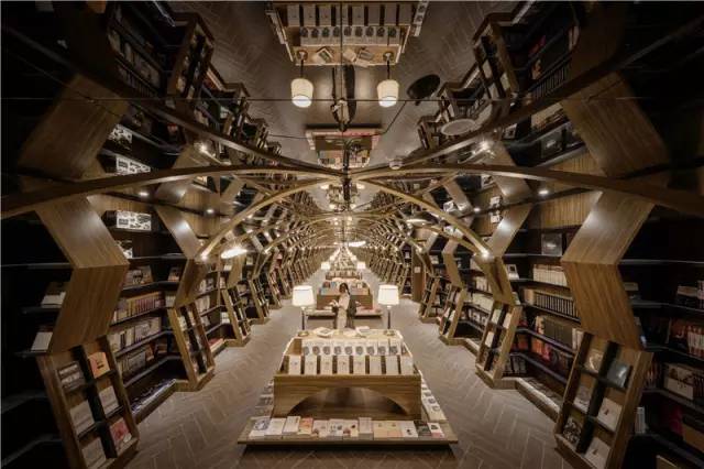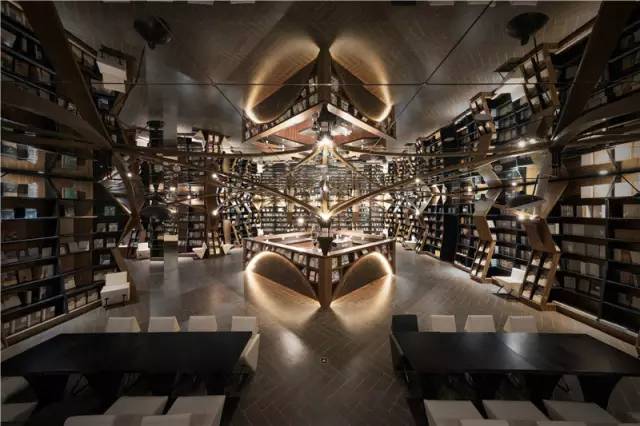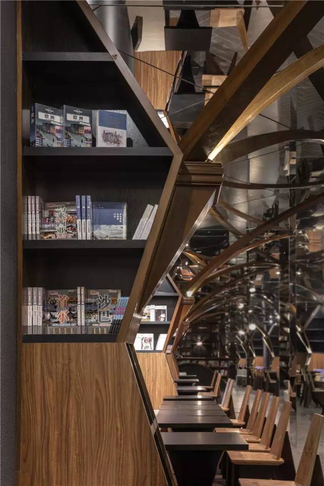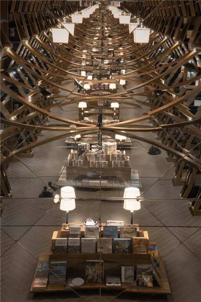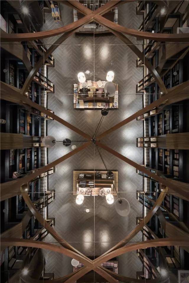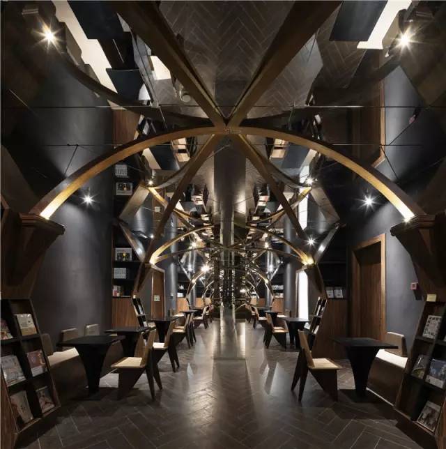 三米多的层高,教堂般的效果,看似格格不入,但充满奇思妙想的李想却采用镜面吊顶的手法,通过镜面的反射,在视觉上尽量提升建筑高度,把两侧书架的高度拉伸到令人仰望的高度。又运用弧形桁架结构制成古朴简练的弧拱,通过镜面的反射、桁架的交集、书架的堆叠,反射出来不同的空间和不同的世界,产生出万花筒般奇幻、绚丽的效果。