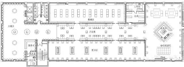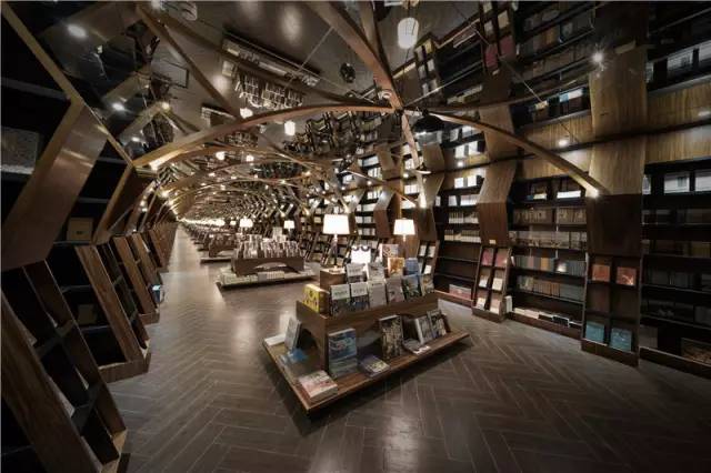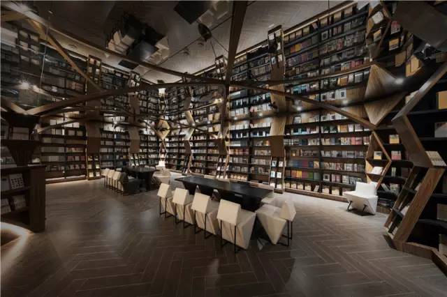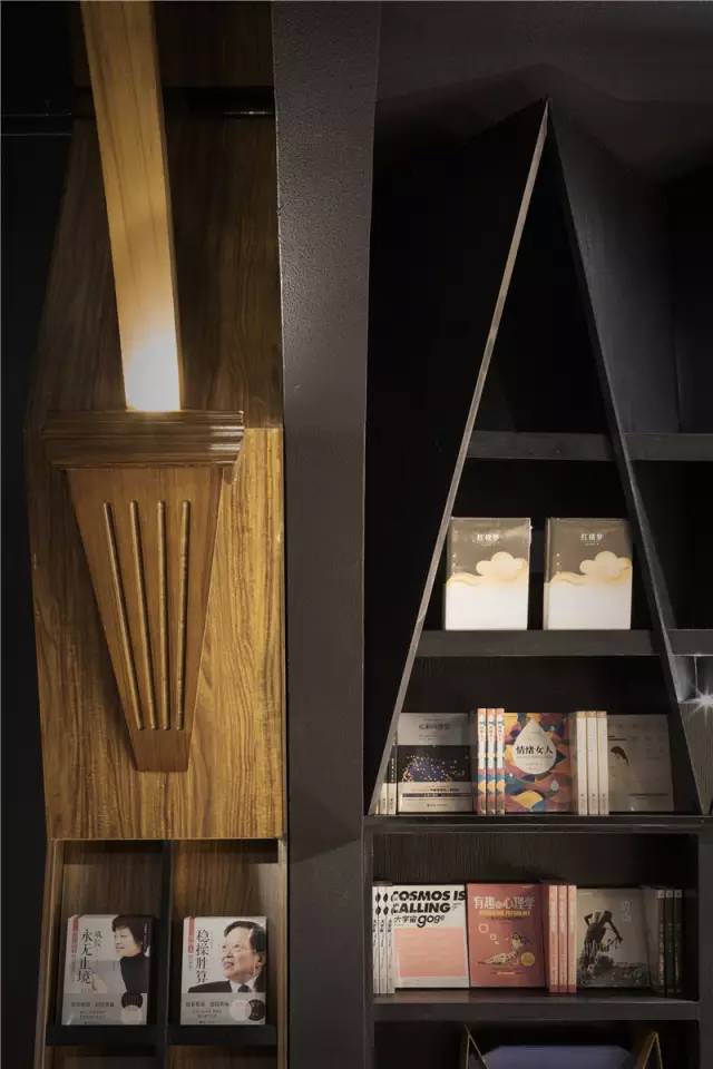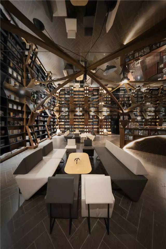 因此设计师将空间划分为三大走廊,并在最端尾的空间,设置了一个大型的可以喝咖啡、做讲座的空间。该空间四面环绕大型书架,顾客在其中阅读、喝茶、聊天仿佛被书海包围。此外,这也是一处灵活变换的空间,如有作家开新闻发布会,或是举办小型读书会,还可以将此空间的桌椅清空,形成开敞的场地。