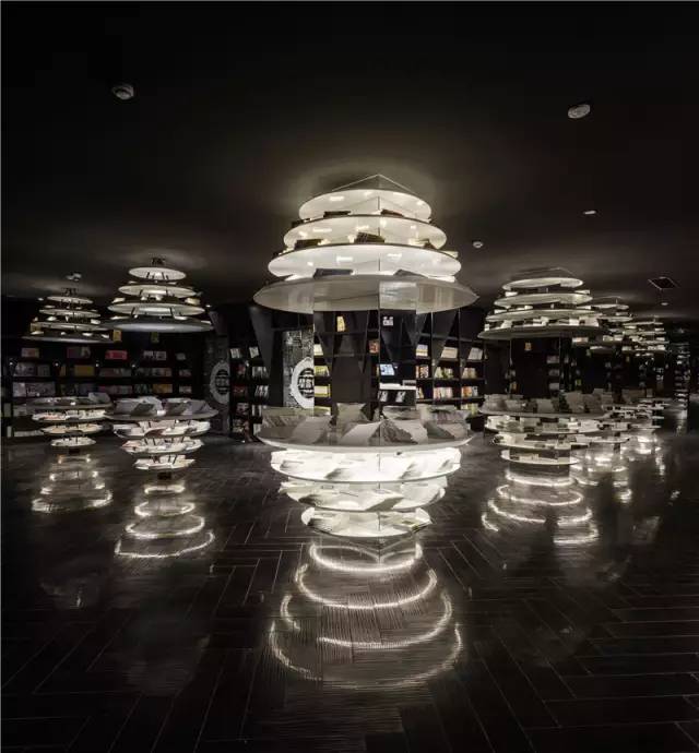 进入钟书阁闵行店,便会见到肃穆黑色书墙和一排散发着柔和白光,旋转姿态的书架。
