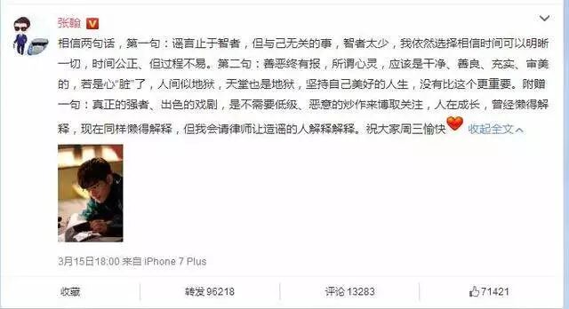 张翰也因为这件事备受影响,最后不得不发通告表示禁止谣传。