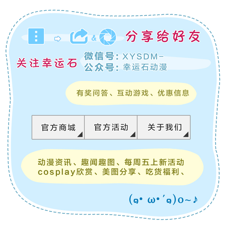 查看动漫周边精品,进入【幸运石天猫旗舰店】,请于淘宝网搜索“xingyunshi旗舰店”查看购买