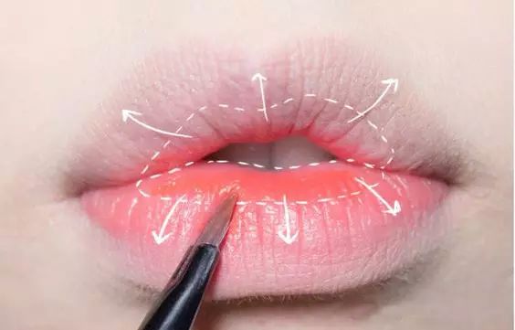为了能突出越界走光唇的特点,一定注意将唇膏晕染的位置扩大,要一直扩大到近乎唇线的位置上。