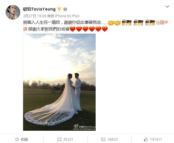 阳春3月,好事连连,女神们都纷纷出嫁了!先有气质女神刘诗诗,后有TVB花旦杨怡~