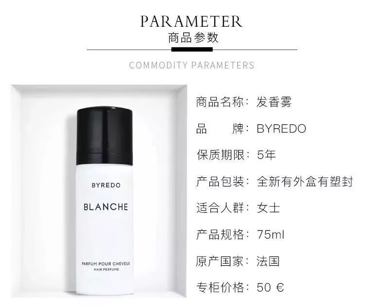 Byredo家的发香喷雾相对来说会比它家的香水味道要淡一些,一共有5款味道。个人比较推荐这三种:Blanche白色浪漫、Gypsy water吉普赛水以及La tulipe郁金香。