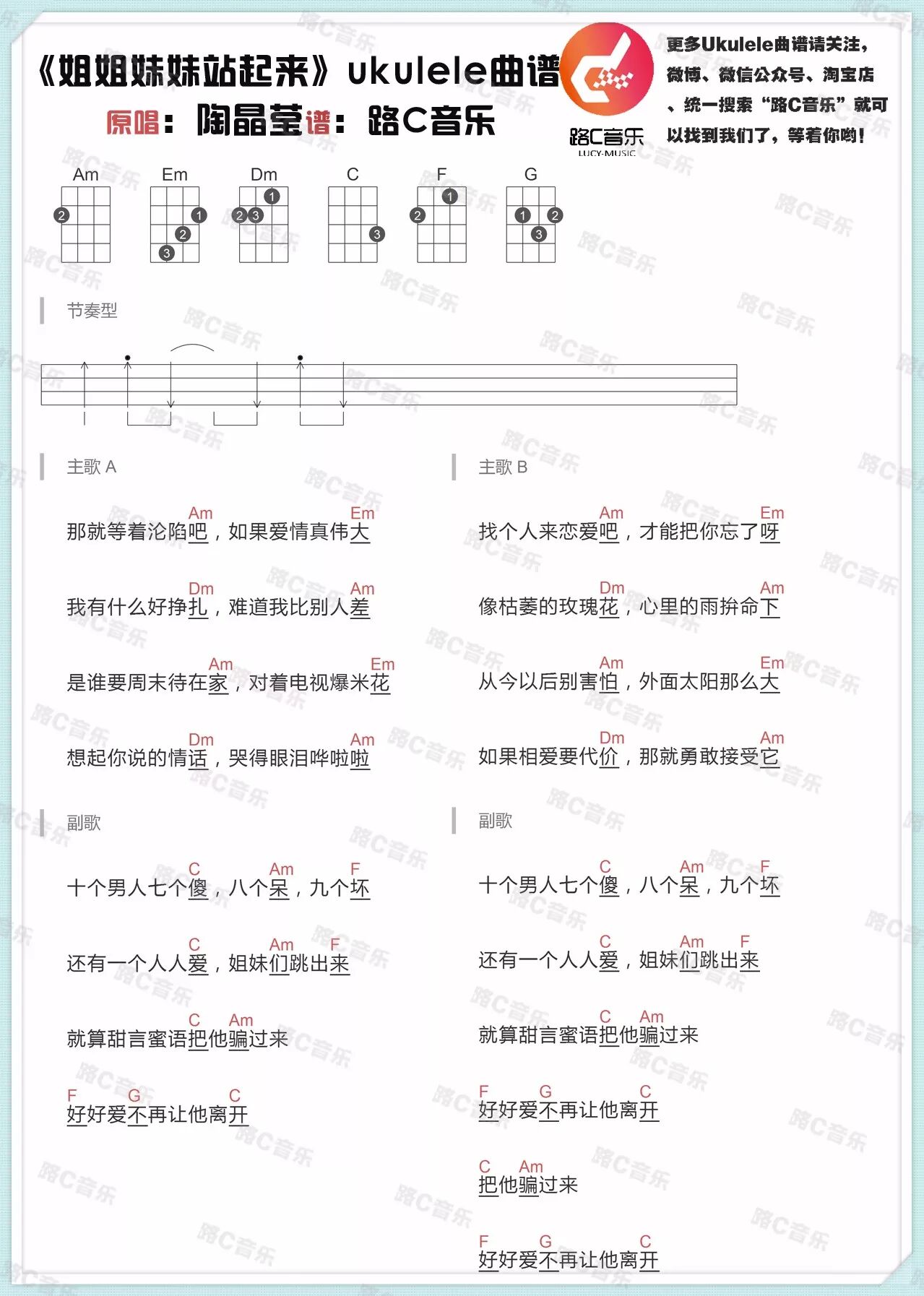 《姐姐妹妹站起来》Ukulele弹唱谱 原唱:陶晶莹 路C音乐 港台女星 2017-12-03 19:34:41 2214 创作不易,用心坚持,欢迎请BaGua喝几杯爱心咖啡!打赏并支持本文 打赏并删除本文 路C音乐出品 创作不易,用心坚持,欢迎请BaGua喝几杯爱心咖啡!打赏并支持本文 打赏并删除本文 感谢您的支持鼓励,我会继续努力的!文章地址:用户邮箱:打赏金额:USDT 请输入数字点击”去打赏“,即可进行打赏支持本文章哦 陶晶莹 About the Author 路C音乐 功能介绍:尤可里里弹唱、声乐培训教育中心,我们只做最时尚的音乐教学 Related Posts 当年素面朝天要多纯洁就有多纯洁|「素颜」• 许嵩/何曼婷(尤克里里弹唱演示+教学+谱) 2020-06-29 11:47:33 林宥嘉翻唱超越原唱,让无数人心酸 |〈成全〉/刘若英 尤克里里曲谱+演示+教学 2018-05-27 19:59:51 520换一种语言说我爱你|〈爱你〉/王心凌 尤克里里曲谱 2018-05-20 23:01:26 「路C音乐」〈我爱洗澡〉范晓萱/尤克里里曲谱 2018-02-25 23:35:56 《姐姐妹妹站起来》Ukulele弹唱谱 原唱:陶晶莹 2017-12-03 19:34:41 发表评论