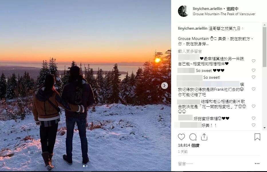 林依晨近来和姐妹掏一起,飞往温哥华旅行,期间老公林于超也陪伴在身边。她9日透过IG发文,晒出夫妻俩的合影,感性写道:「美景,就在我前方。你,就在我身旁…。」画面中,2人紧靠在一起,站在雪地中远眺整片美景,她更伸手搂住老公的腰,流露出满满的甜蜜感。
