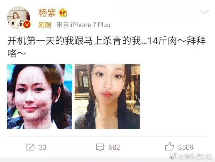 ▲在拍摄的过程中,杨紫还PO出一条微博说和开机第一天的自己相比,已经足足瘦了14斤。