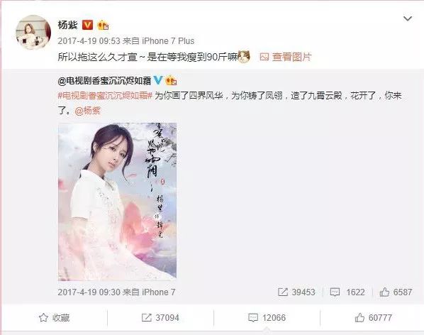 ▲早在去年该剧前期宣传时,杨紫就曾转发官方微博并自嘲,官方宣传之所以拖这么久是在等她瘦到90斤。