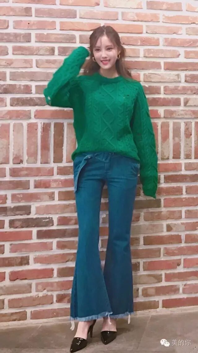 韩国Tara组合成员朴孝敏用绿色麻花毛衣搭配喇叭裤,时髦又显高。