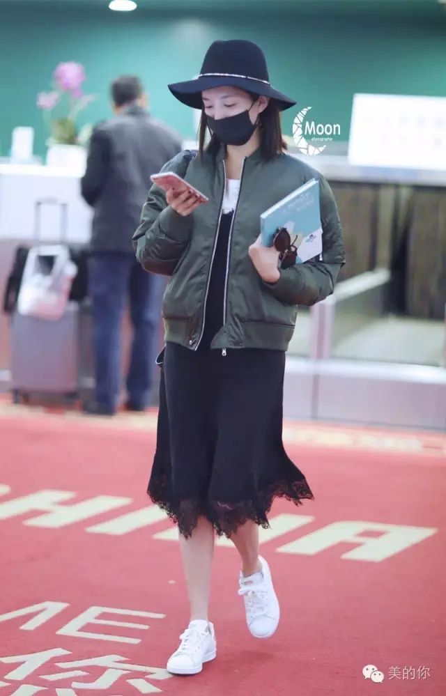江疏影也超爱军绿色的夹克,搭配黑色九分裤和小白鞋利落帅气,换上蕾丝裙则多了份柔美女人味。