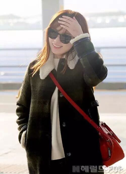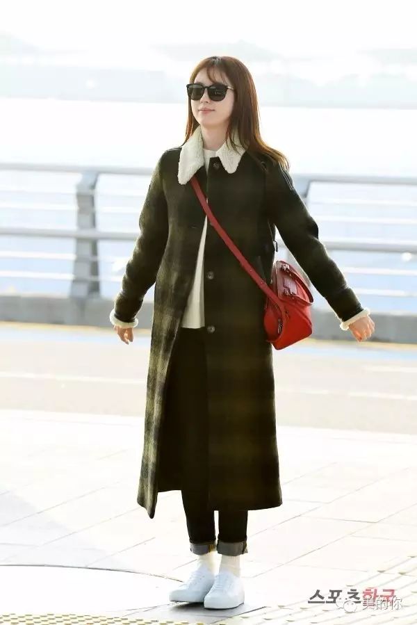 除了纯色你也可以像韩孝周欧尼一样选择绿色格纹款大衣,白色的羊羔绒领子可爱又暖和,红色斜跨包包是整身look的亮点~