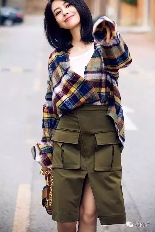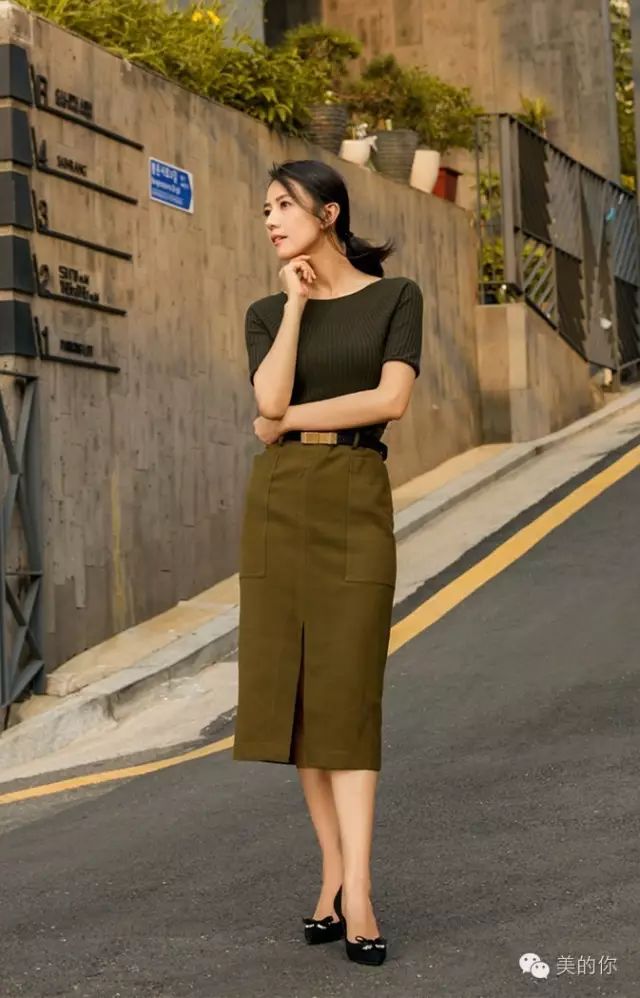 虽说虽说绿色单品在大部分人心里是偏帅气中性的风格,但选对单品照样能穿出小女人娇俏美感。高圆圆的军绿色开叉铅笔裙就是长草的单品之一!