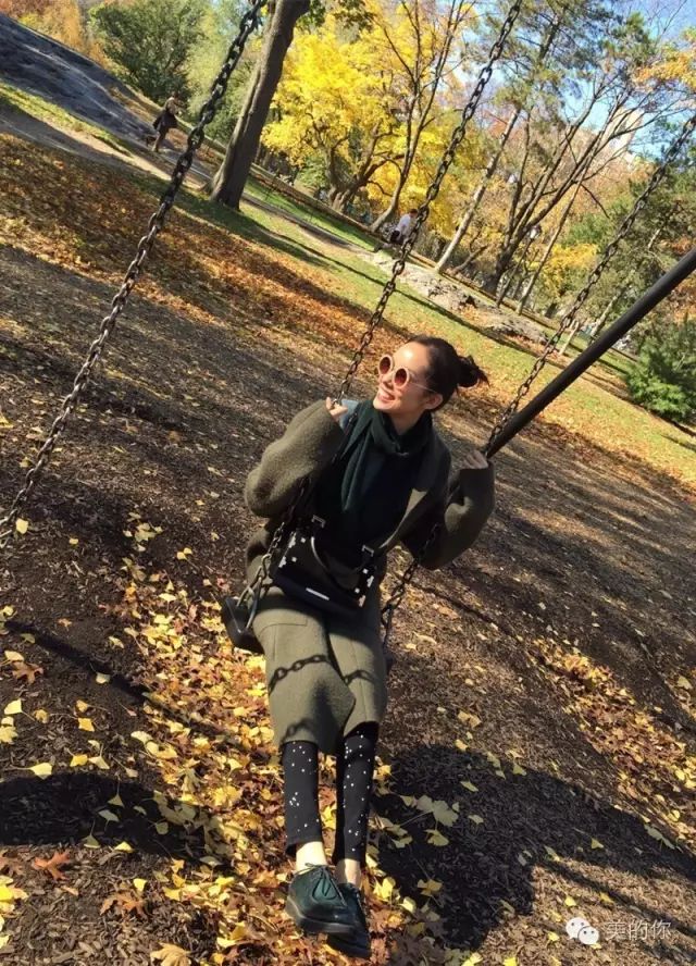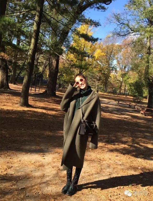 超模孙菲菲用墨绿色大衣内搭同色系高领毛衣,和金色的落叶秋景超配噢~