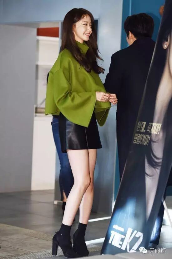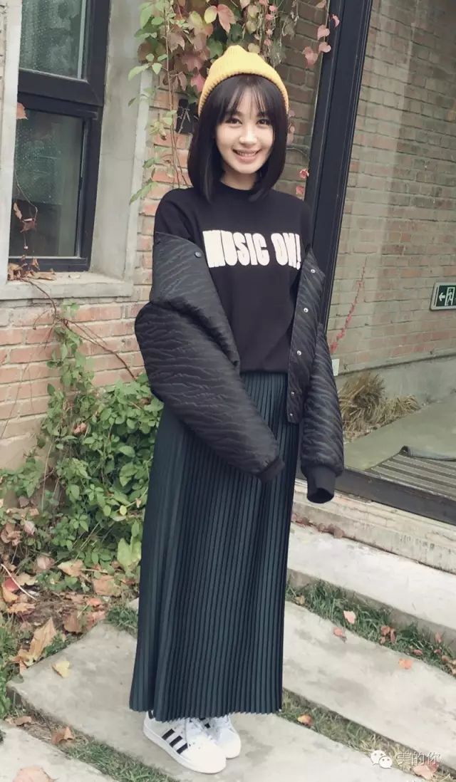 允儿的绿色廓形oversize卫衣配黑色A字半裙超显腿长~
