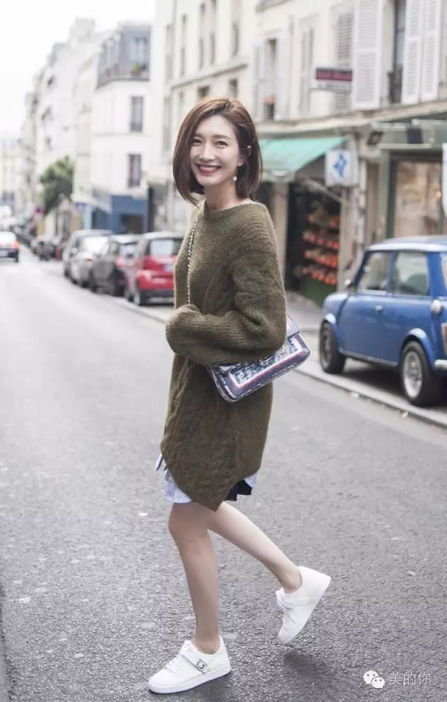 梳着lob头的江疏影用墨绿色oversize毛衣内搭长款衬衫,脚踩减龄小白鞋,唇红齿白太好看!